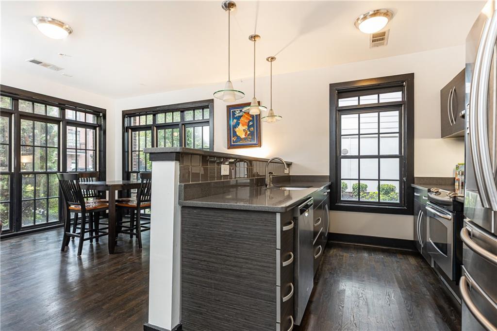 Step into this sunlit sanctuary, located just a stone's throw from the eclectic vibe of Little 5 Points and the tranquility of Candler Park. This condo boasts an airy atmosphere with its soaring ceilings and expansive windows that fill the space with natural light. Hardwood floors guide you through an open-concept living and dining area, leading to a modern kitchen equipped with stainless steel appliances, granite countertops, and a breakfast bar perfect for casual dining.
