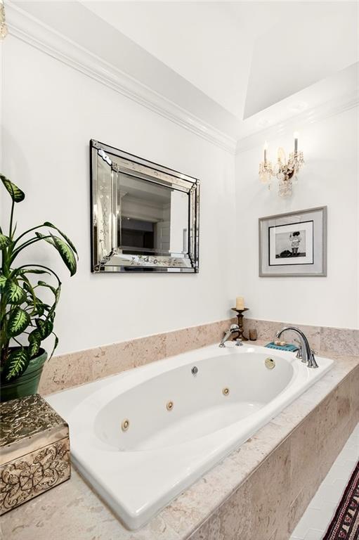 The upper level is dedicated to the owner's retreat, offering a spacious bedroom, sunlit sitting room, walk-in closet, and spa-inspired bath with dual vanities and a whirlpool tub. A secondary bedroom suite with a generous walk-in closet and an upstairs laundry room complete this level.